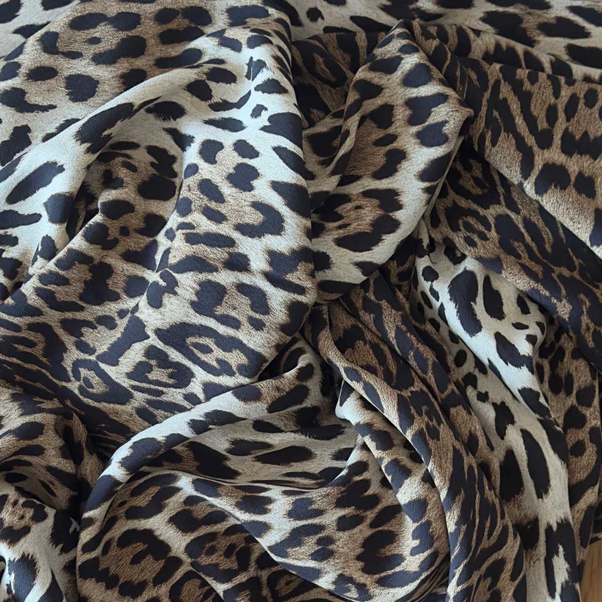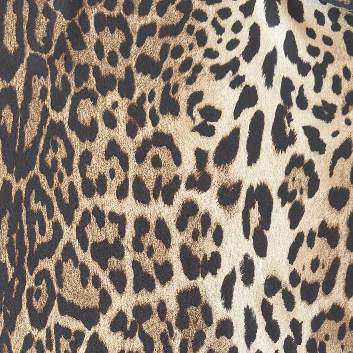 This Leopard Print Viscose Crepe Fabric features a timeless animal print in classic black and brown tones set against a soft caramel background. The fluid drape and elegant matte surface give this design a sophisticated feel, making it ideal for creating statement garments with movement and softness.