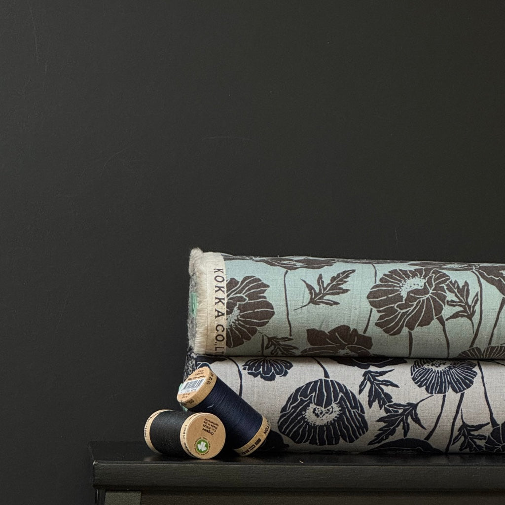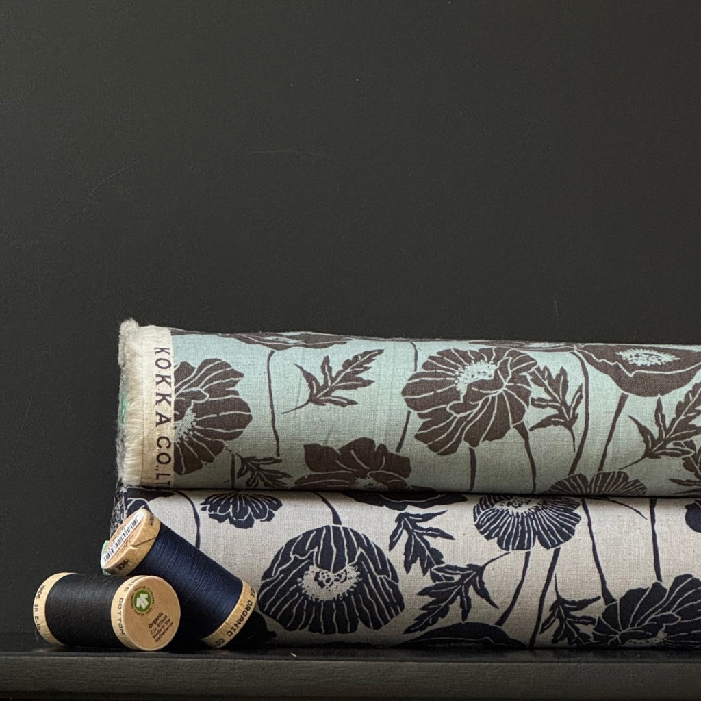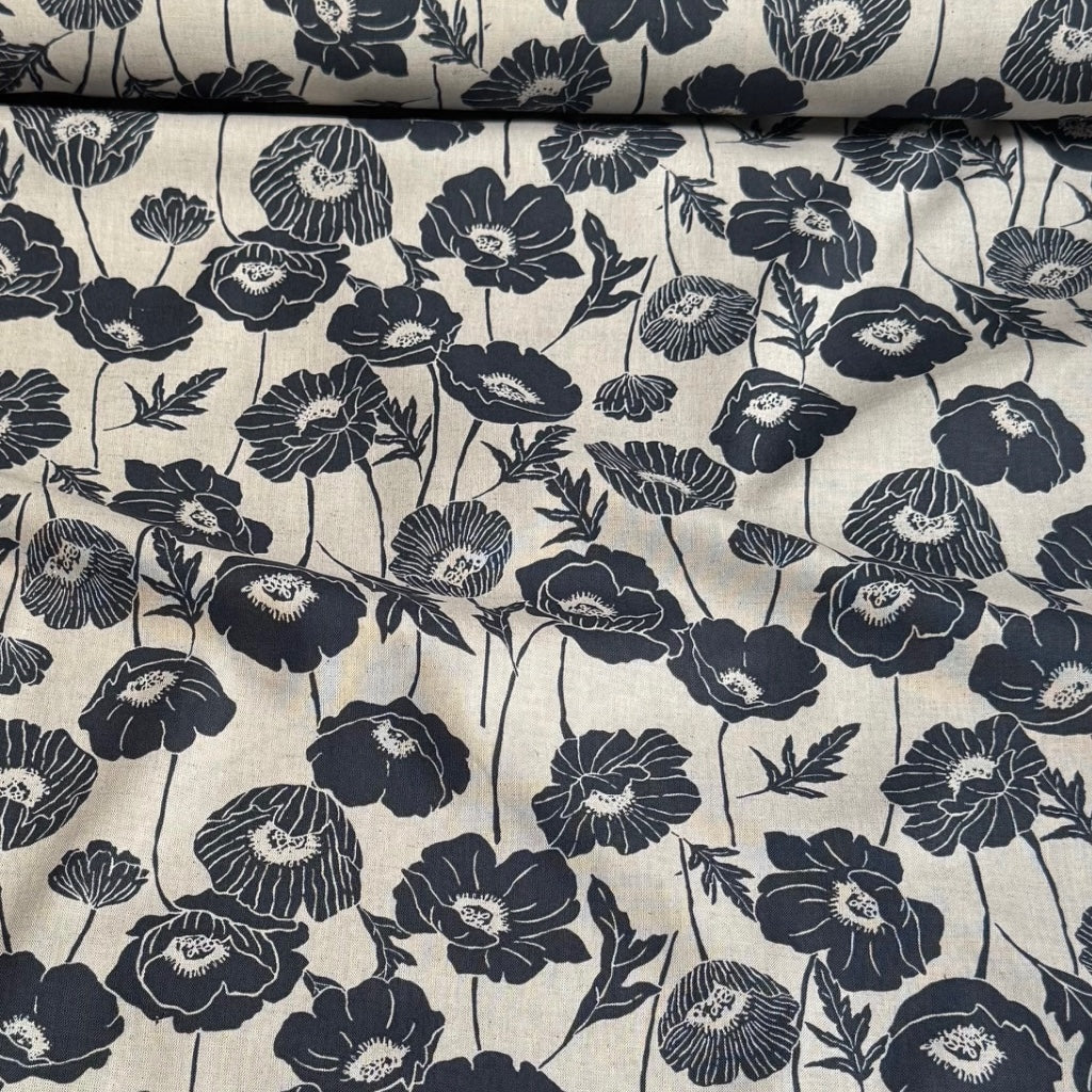 KOKKA • Poppy Cotton Linen Fabric • Navy on Grey • NEW