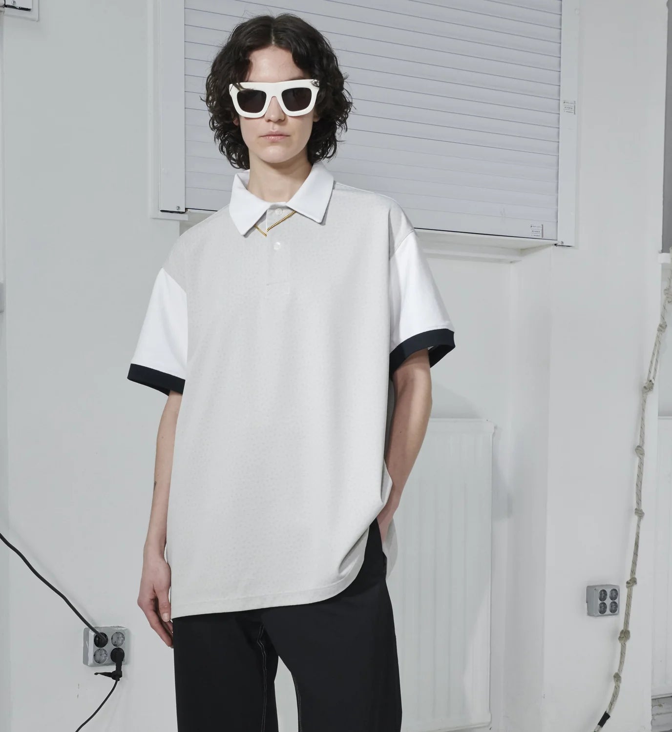 The shape is straight, wide and intentionally oversized, with dropped shoulders and sleeves that fall just above the elbow. The dress version sits above the knee and features practical in-seam side pockets, while the neckline and collar are kept classic and understated for everyday wear.