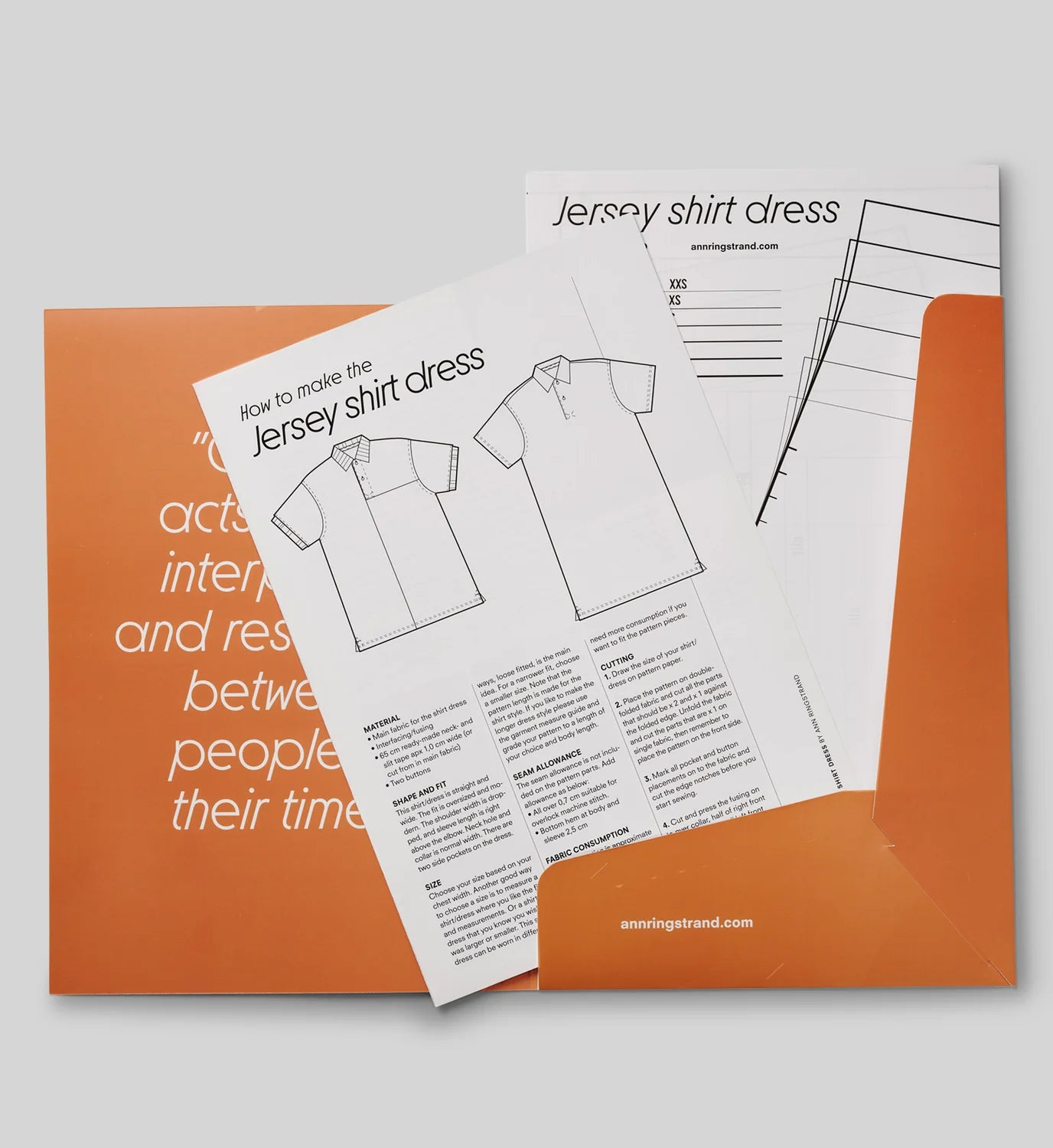 The Jersey Dress Sewing Pattern by Ann Ringstrand is a contemporary jersey shirt dress with a relaxed, oversized silhouette and a distinctly modern feel. Designed to be sewn at home, this versatile pattern includes both shirt and dress variations, along with women’s and men’s size charts, making it a flexible, inclusive design.