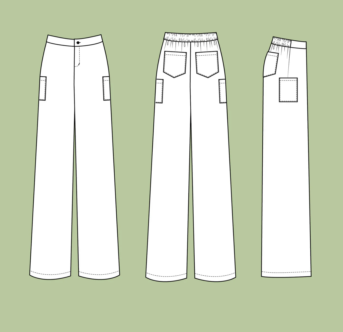 Key features include a flat front with a zip fly and an elasticated back waistband, offering both structure and comfort. With no side seams, they’re simpler to cut and sew, making them an excellent choice for showcasing bold prints or directional fabrics. Practical patch pockets on the sides and back provide plenty of room for everyday essentials.