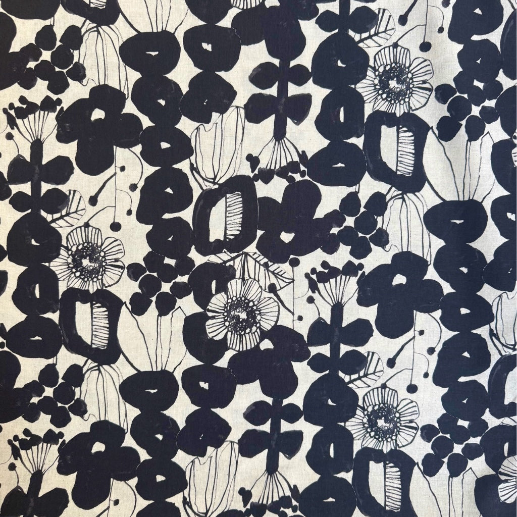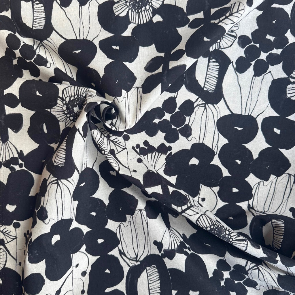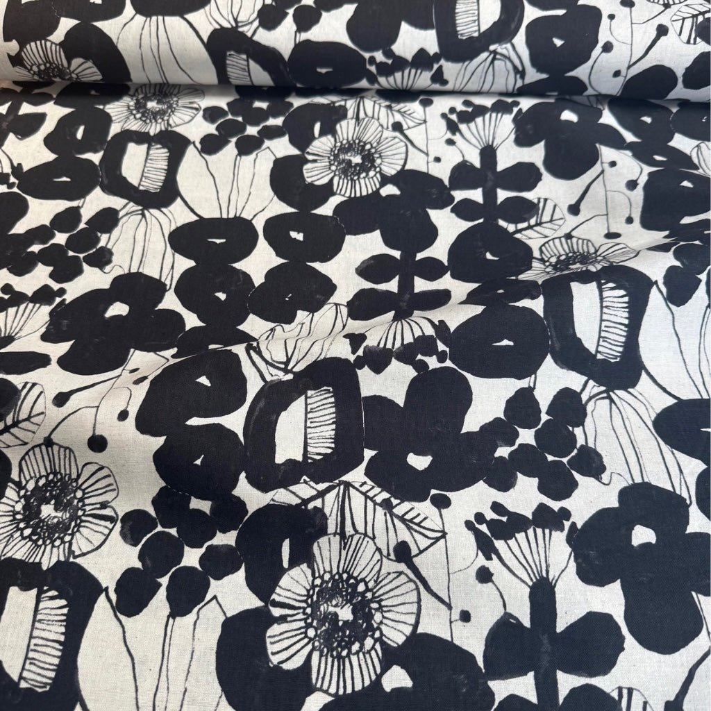 Linnea Floral Cotton Linen Fabric by Kokka is a bold yet timeless design featuring a stylised, graphic floral motif in classic black on a warm cream base. With its clean lines and architectural feel, this monochrome print has a distinctly Nordic-inspired aesthetic, making it ideal for contemporary handmade garments.