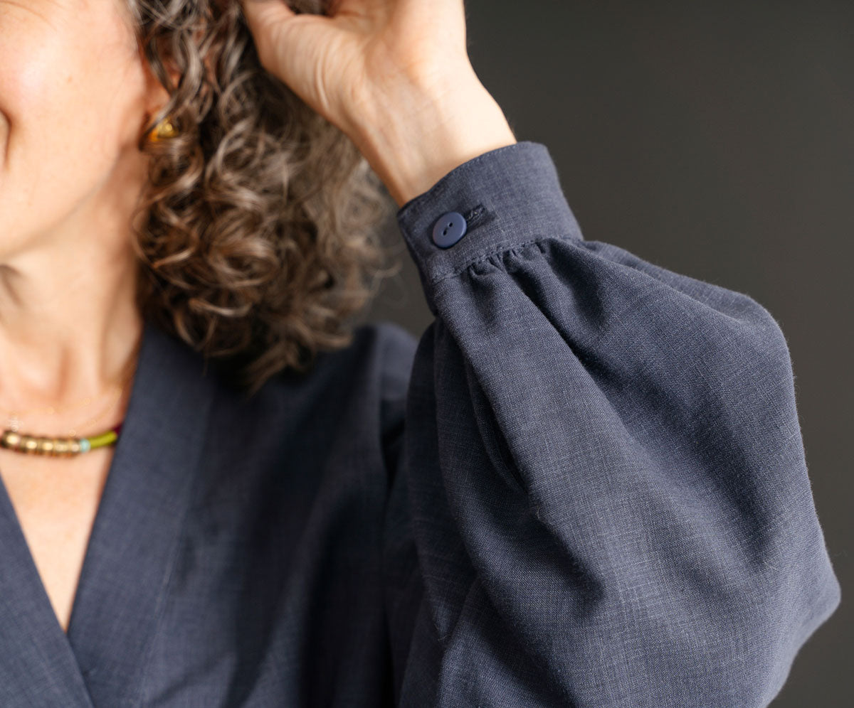 The design includes billowy long sleeves or an alternative short-sleeve option finished with cuffs, giving you flexibility across seasons. Both views feature practical side pockets, a clean neck facing, and a flattering, forgiving fit shaped with pleats and darts.