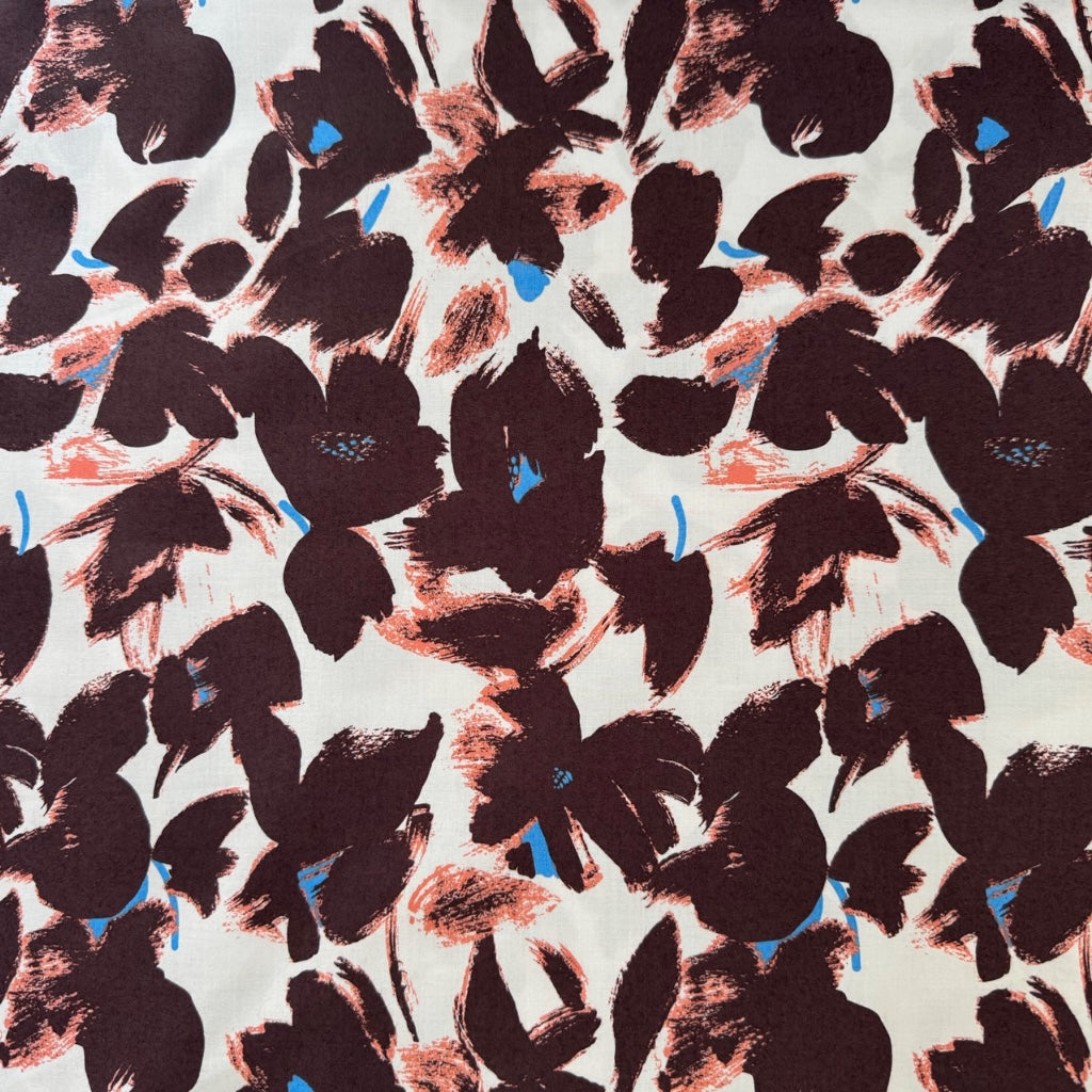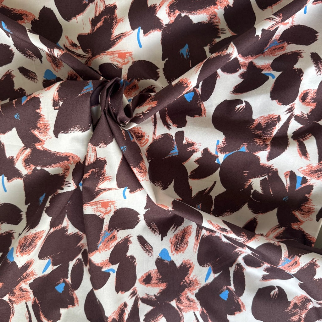 Designed and made in Japan by Hokkoh, this beautiful contemporary cotton fabric features an expressive hand-painted floral design in warm brown tones, accented with blue and salmon pink on a soft warm cream base. Its painterly style brings an artistic yet timeless quality to any handmade project. To give you a sense of scale, the largest of the flowers are approximately 90mm across.