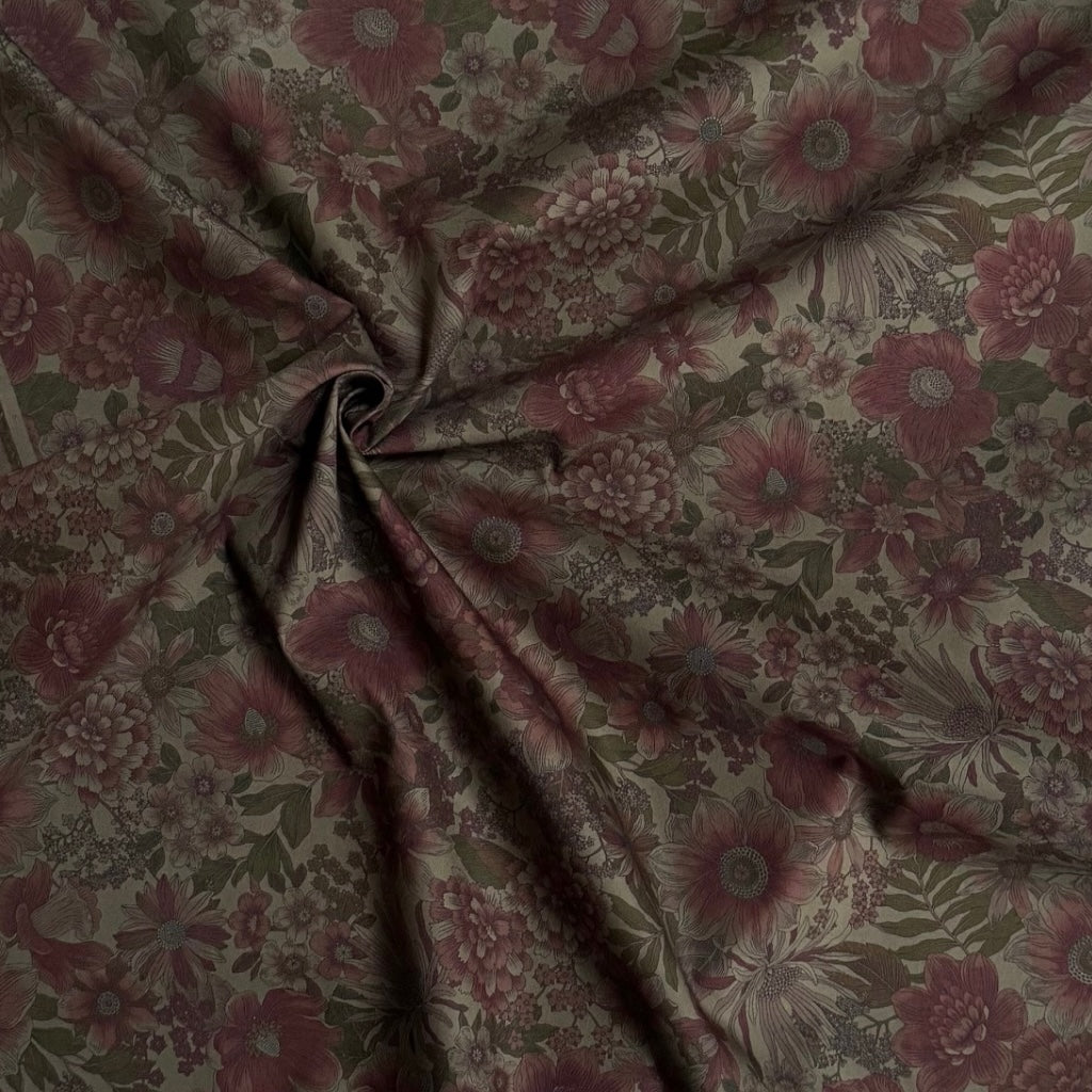 From Japanese brand Sevenberry, Moody Blooms is a striking floral cotton poplin featuring an abundance of sketched flowers in earthy muted tones of dark taupe, khaki green, brown and dusky russet red on a taupe background. The smooth, crisp finish and modern colour palette give this print an edgy, contemporary twist on a classic floral. To give you a sense of scale, the largest flower is approximately 70mm in diameter.